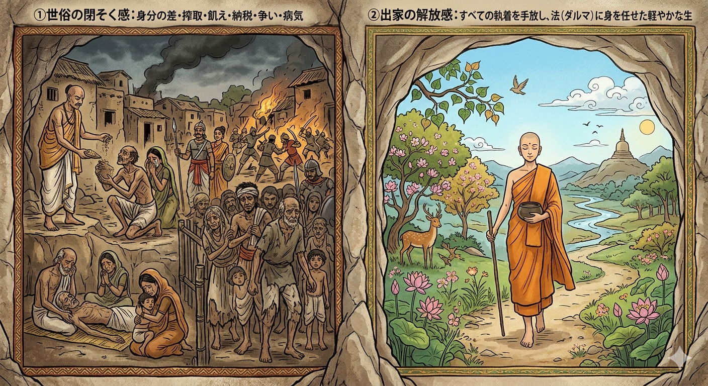 【図解:世俗の閉塞感と出家の開放感の対比】