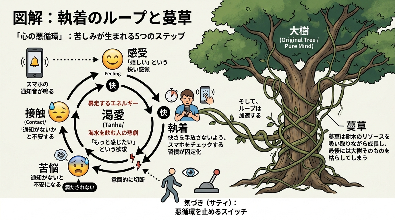 このループ(自己強化ループ)が回るたびに、執着はより強固になります。経典ではこれを「樹木にまといつく蔓草(つるくさ)」に例えています。蔓草は最初は細い芽ですが、樹木のリソースを吸い取りながら成長し、最後には大樹そのものを枯らしてしまうのです。今日からできる練習: