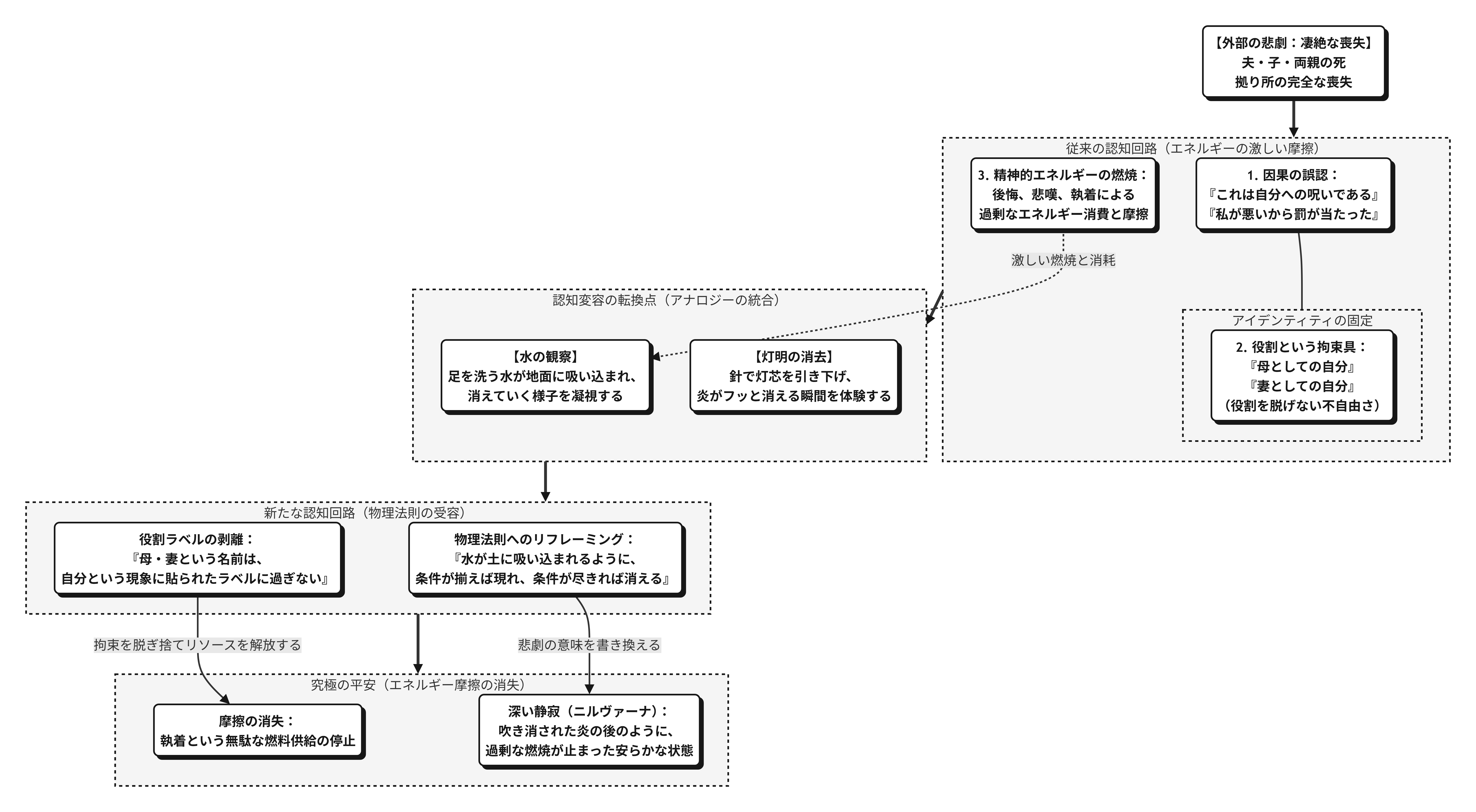 ② 悲劇は「呪い」ではなく「物理法則」として見ることができる パターチャーラーの転換は、悲しみの消滅ではありませんでした。悲しみの「意味の更新」でした。同じ出来事が、「自分への罰」から「条件の必然的な帰結」として見えたとき、人はその出来事と共に生きられるようになります。