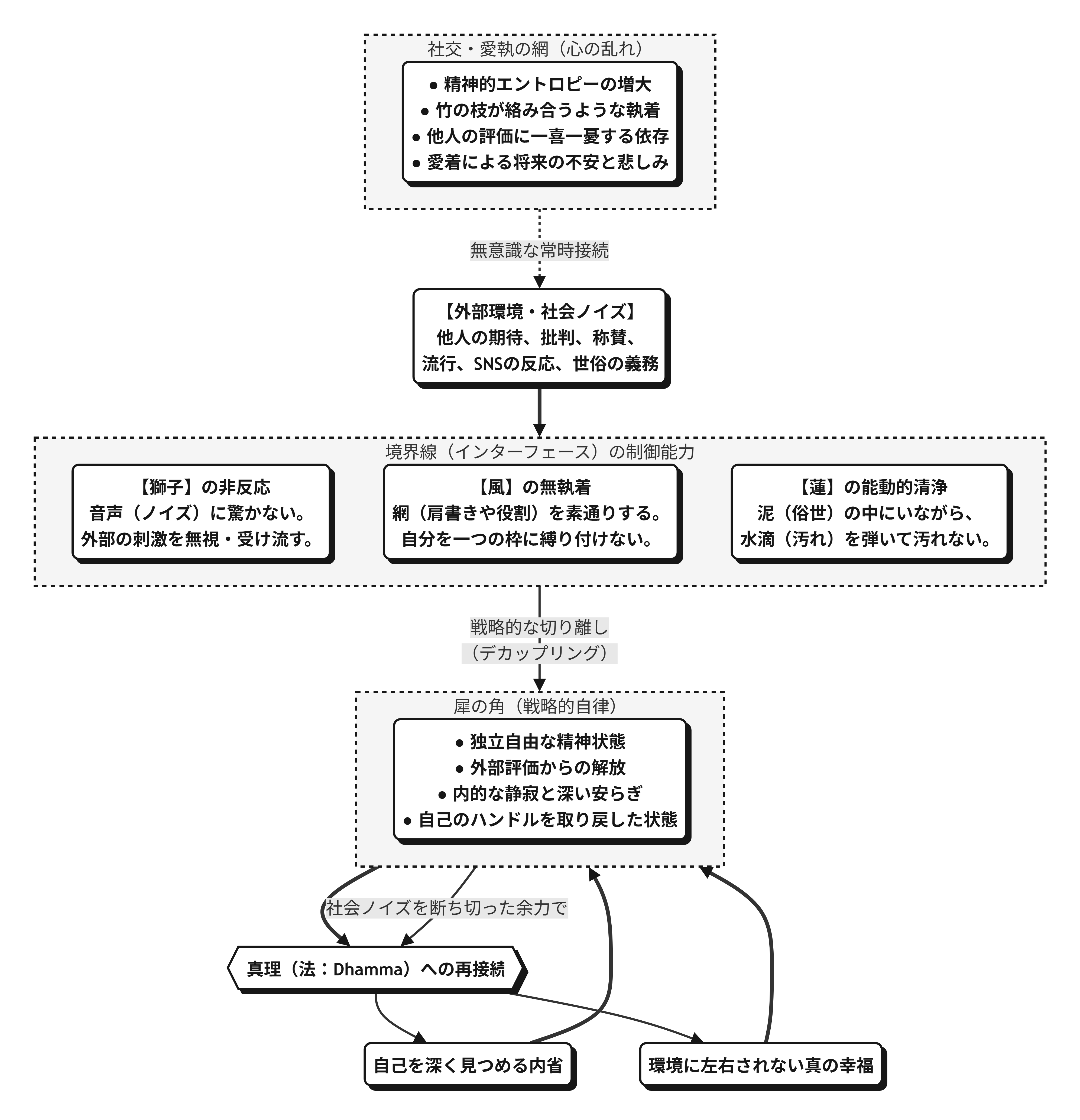 図解 生存戦略としての「デカップリング(切り離し)」:犀の角の動態モデル